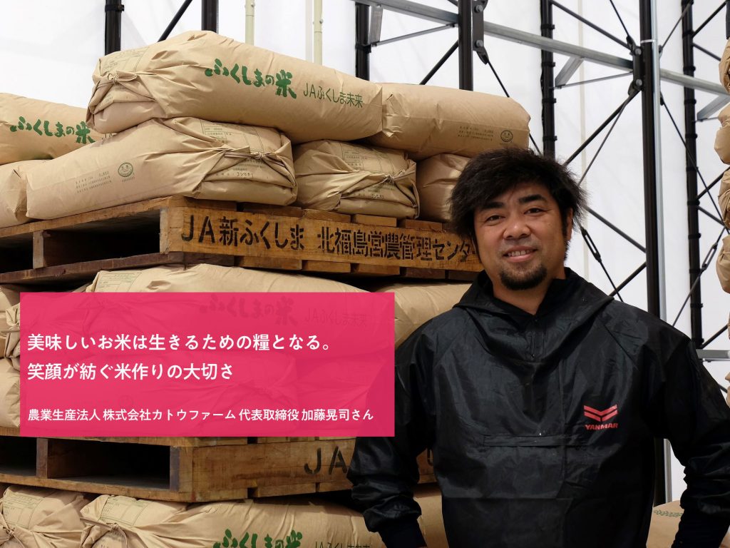 「祖父の田んぼを受け継いで失敗や震災などいろいろありましたが、たくさんの人の応援のおかげで楽しく米作りに励んでいます。これからも美味しくて笑顔がこぼれるようなお米を作って、たくさんの方に届けていきたいですね。この地域の農業を盛り上げながら、これからもがんばります」。
